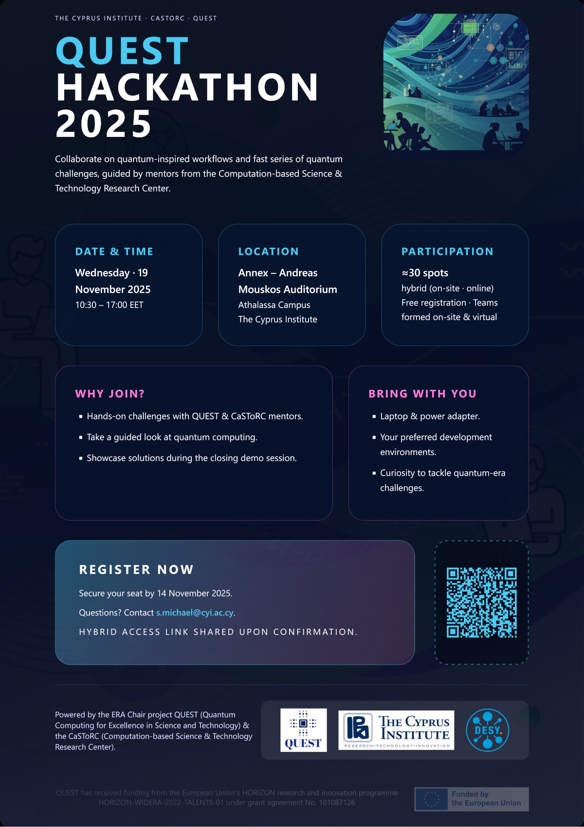 The Cyprus Institute is pleased to announce the QUEST Hackathon 2025, a one-day, beginner-friendly mini-hackathon on Wednesday, 19 November 2025, at the Andreas Mouskos Auditorium, Athalassa Campus (hybrid participation available). Participants will work in small teams to solve short, guided quantum-computing challenges.